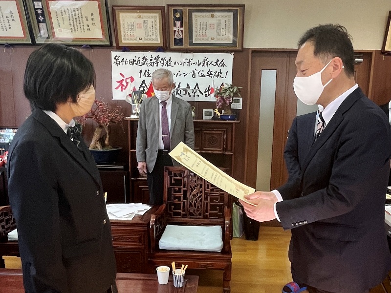 【インターアクトクラブ卒業生記念品授与式】 場所:彦根総合高等学校 理事長室 |