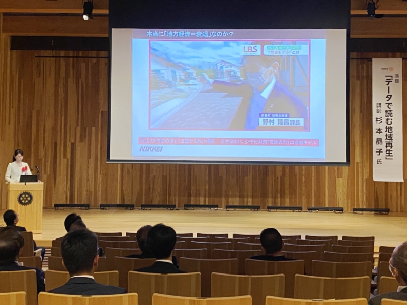 【45周年記念事業拡大例会「彦根城世界遺産のあるまちづくりに向けて」データで読む地域再生 〜人口減社会でも「強い県・市町村」の秘訣は〜】 杉本晶子氏 日本経済新聞 地域ビジネスエディター 場所:多賀結いの森 ささゆりホール |